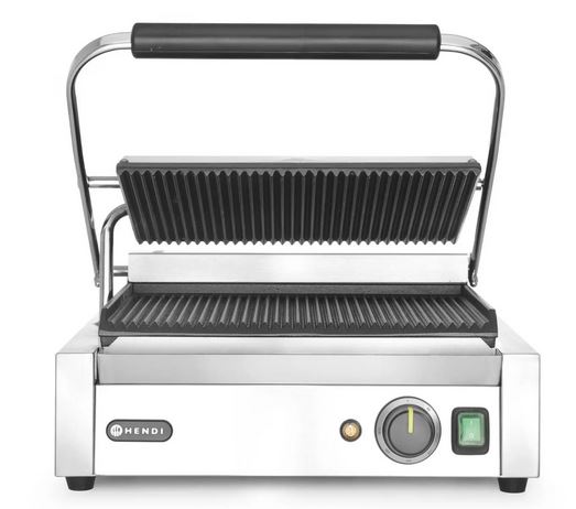 Kontaktní gril HENDI Panini je profesionální zařízení určené pro rychlou přípravu panini, sendvičů, masa i zeleniny. Má vroubkovanou horní i spodní grilovací desku, což zajišťuje typický grilovací vzor z obou stran a rovnoměrné propečení.